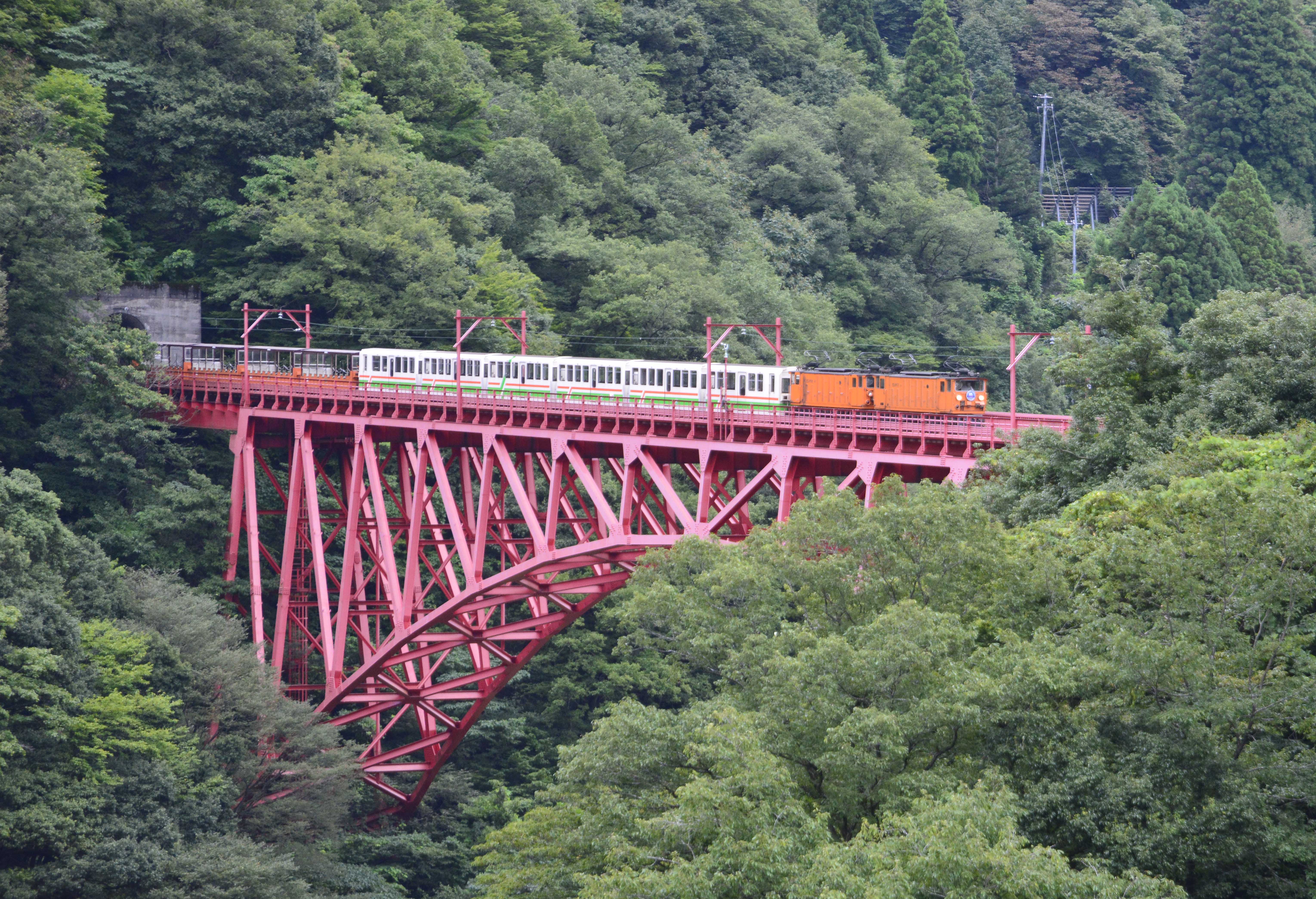 黒部峡谷トロッコ電車のイメージで、新山彦橋を、宇奈月温泉の駐車場脇にある「やまびこ展望台」から眺めたトコロ。