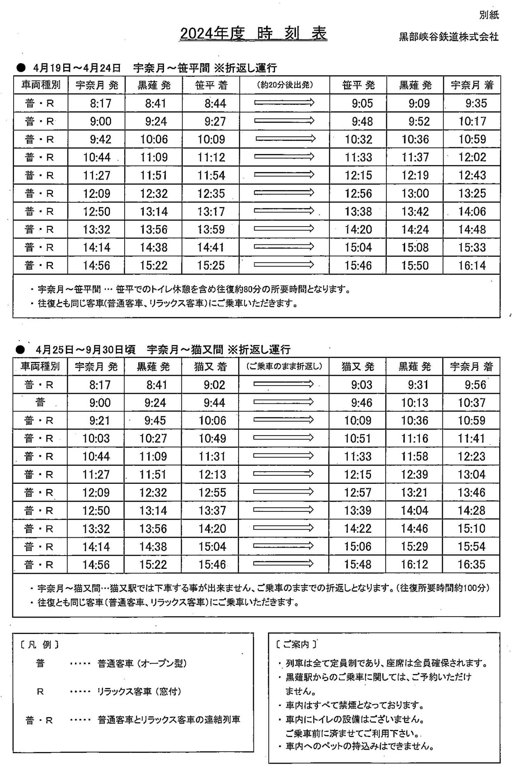 2024シーズンは令和6年能登半島地震に伴う鐘釣橋損傷により9月頃までは 宇奈月-猫又 間での運行になる
